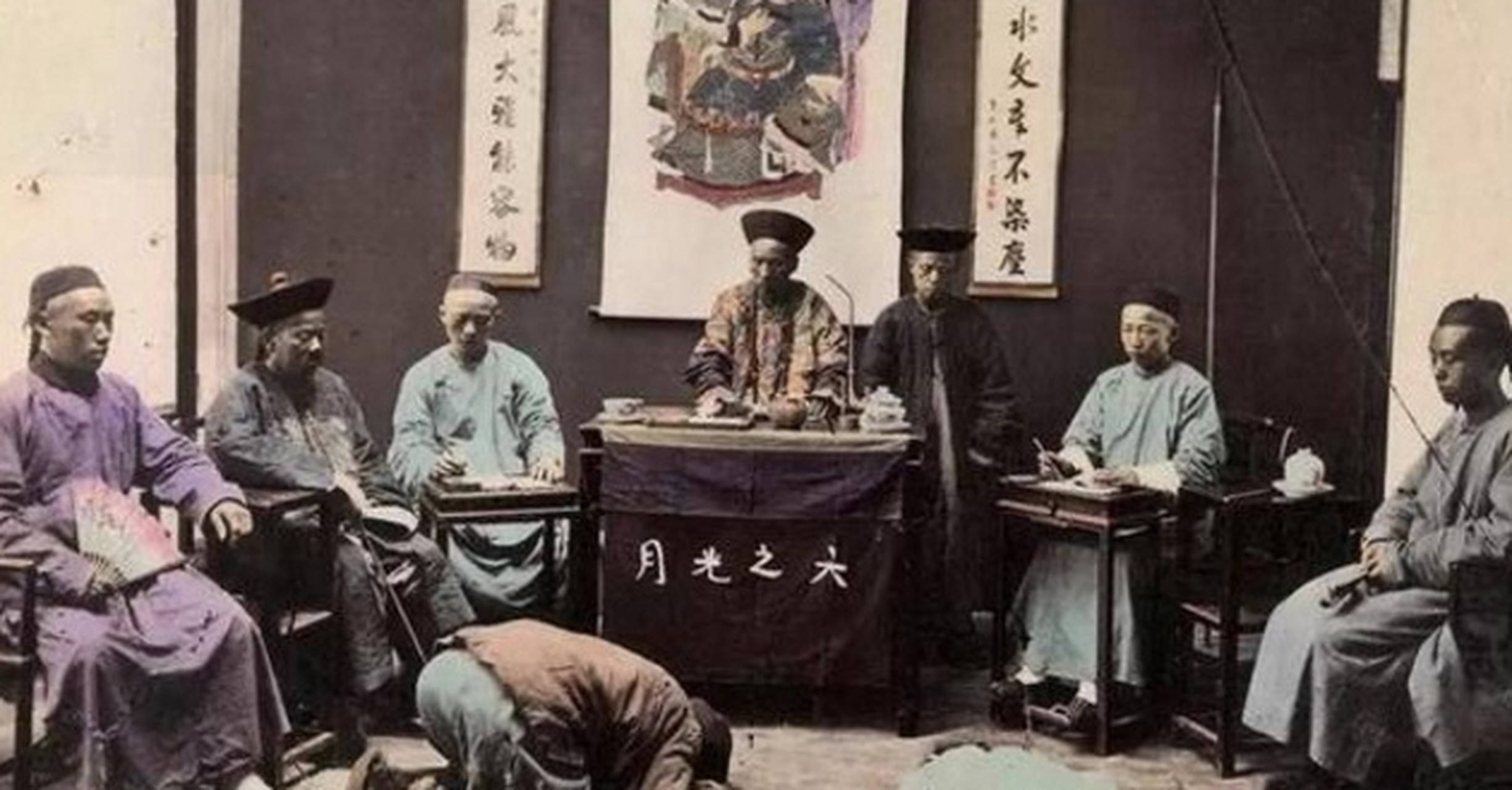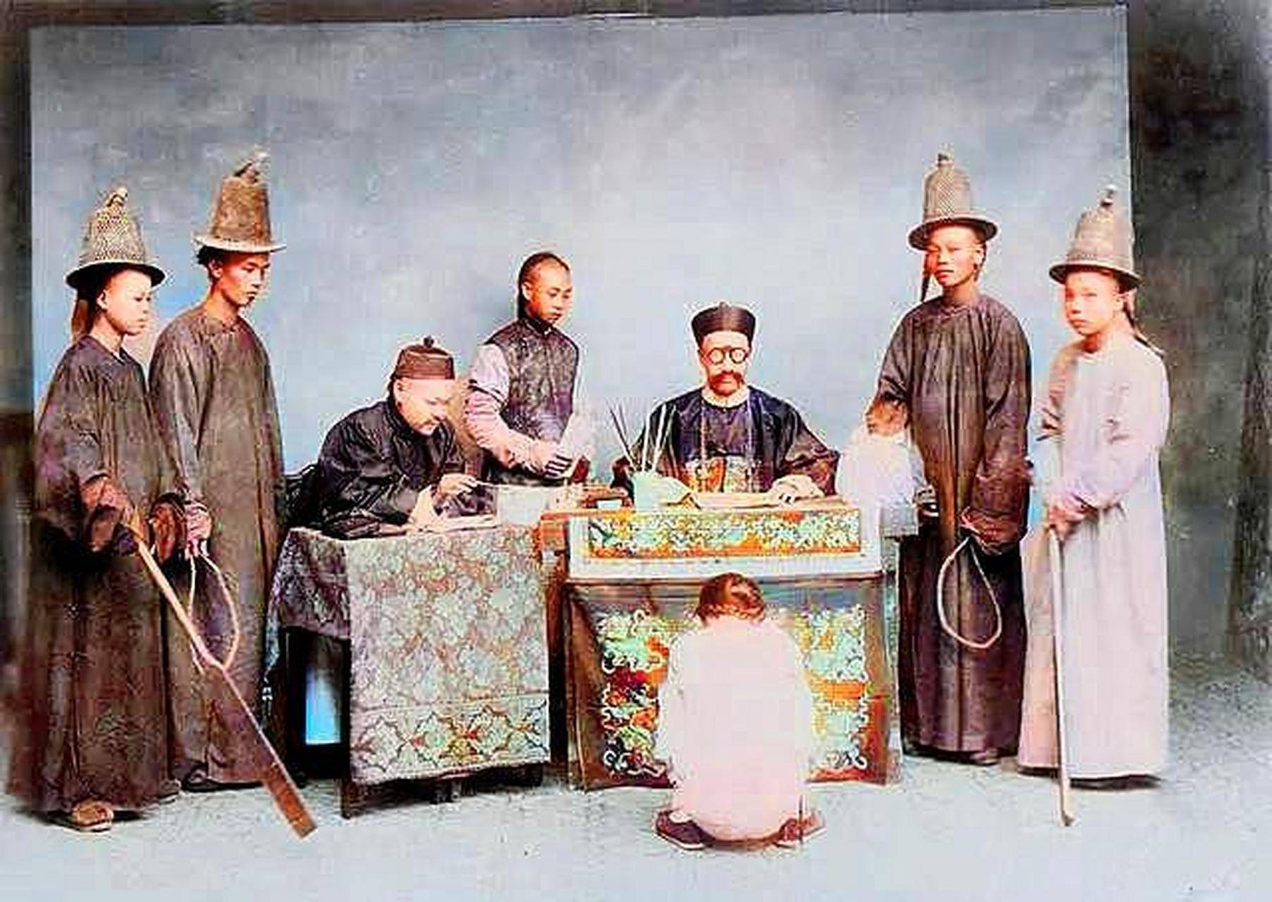 1890年的一个清晨,直隶省某县的衙门口已经围满了看热闹的百姓。他们踮着脚往公堂里张望,只见县太爷端坐在公案后,乌纱帽翅随着咳嗽微微晃动,案上的惊堂木被阳光照得发亮。跪在地上的农夫王老五连眼皮都不敢抬,粗布裤子膝盖处磨出的破洞沾着泥灰——他不过是偷了地主家半袋糙米,却要面对「笞杖三十,流放三千里」的判决。这张被英国传教士拍下的老照片里,师爷正低头在竹简上疾书,而两侧衙役的水火棍在地面投下细长的阴影,像极了百姓们喘不过气的命运。